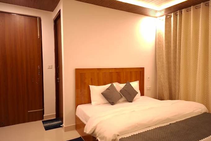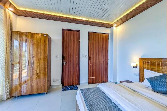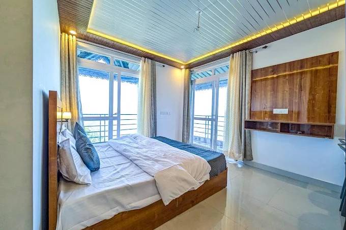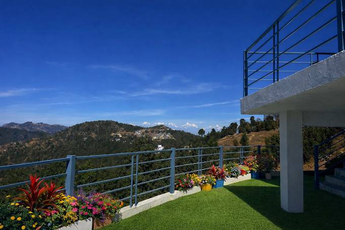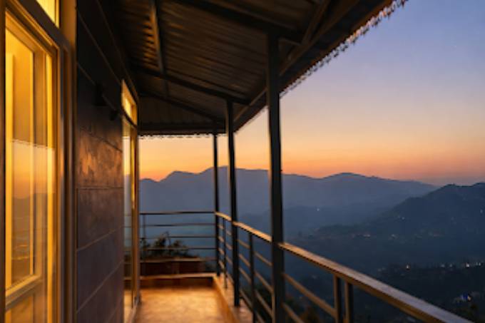 - A stunning hillside retreat glowing at dusk, overlooking twinkling valley lights and a peaceful mountain horizon.