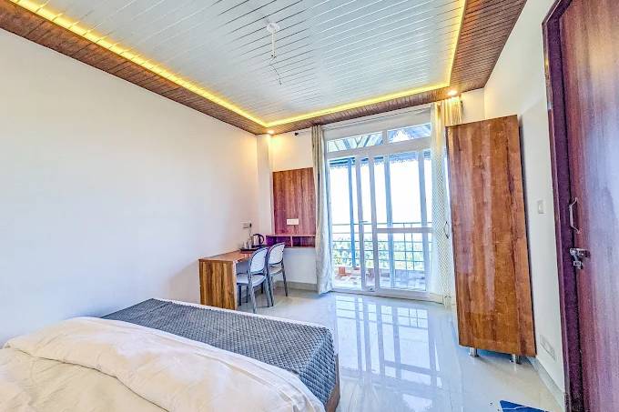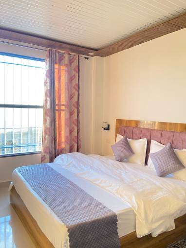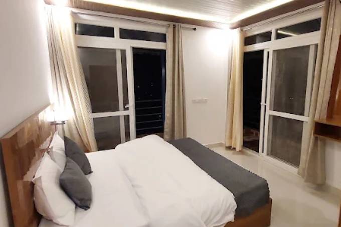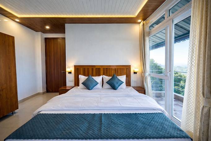 - A stunning hillside retreat glowing at dusk, overlooking twinkling valley lights and a peaceful mountain horizon.